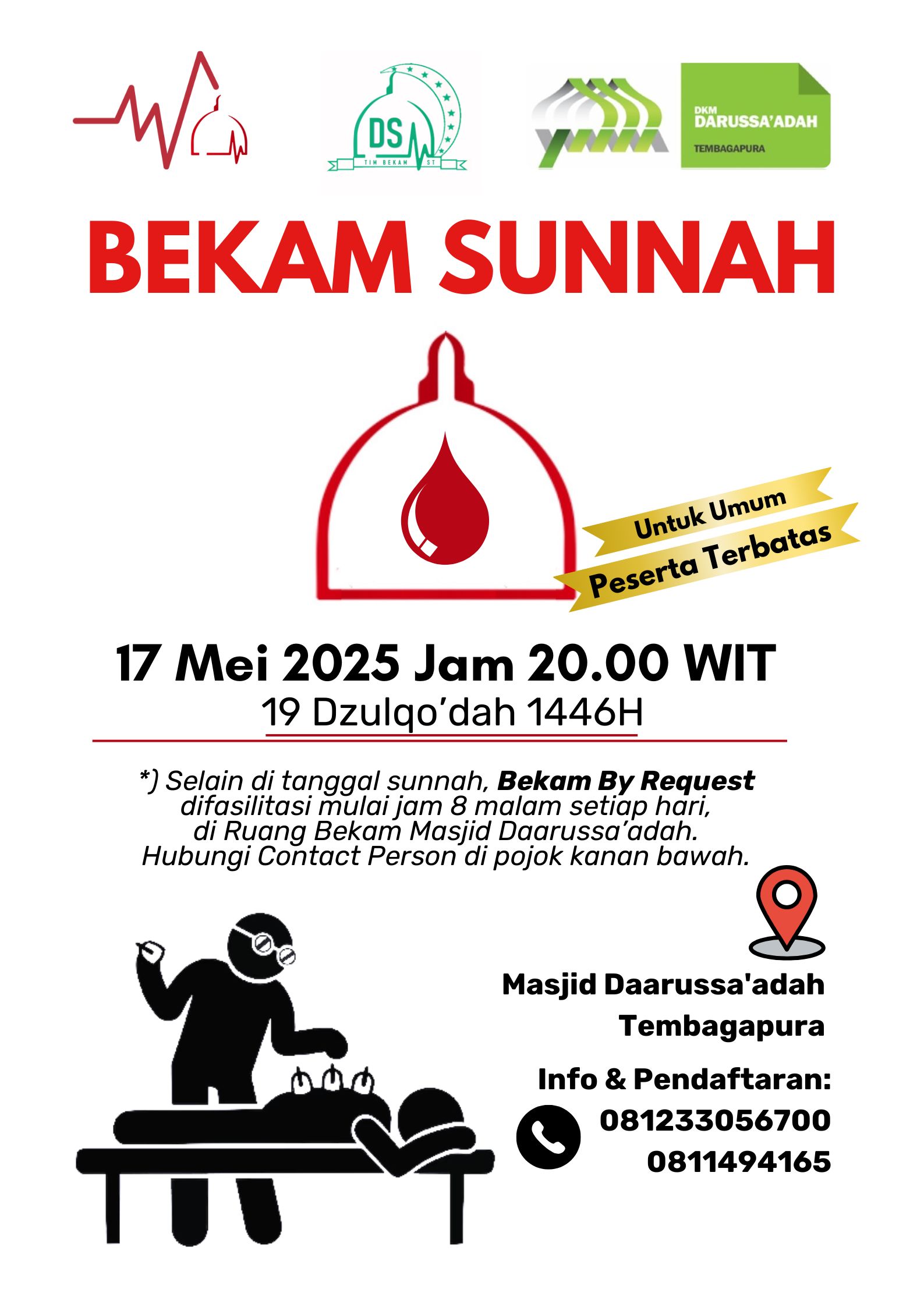 Bekam Massal untuk Jama'ah Masjid Darussa'adah di tanggal sunnah berbekam, 17/19/21 di penanggalan bulan hijriyah.